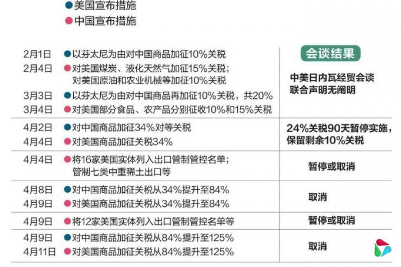 为回应美国加征的高额关税,中国在4月4日宣布包括将16家美国实体列入出口管制管控名单、限制七类中重稀土出口等反制措施,并在4月9日再度祭出将12家美国实体列入出口管制管控名单等措施。