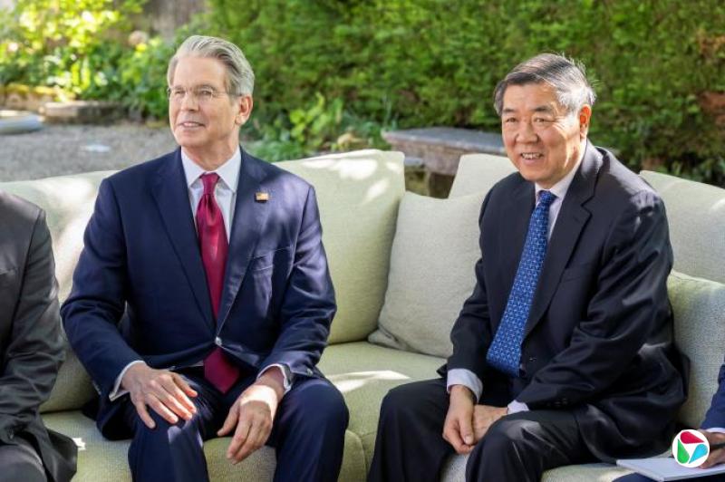 在日内瓦出席贸易谈判的美国财政部长贝森特和中国副总理何立峰5月10日坐在户外沙发上。(路透社)
