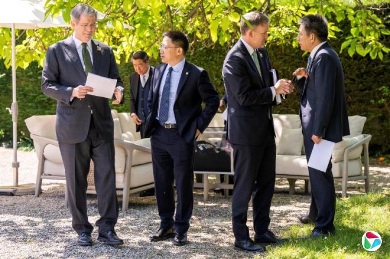 瑞士外交部星期三(5月14日)发布的照片显示,在日内瓦出席贸易谈判的中国商务部国际贸易谈判代表兼副部长李成钢(左一)、中国副总理何立峰(左三)、美国财政部长贝森特(右二)和美国贸易代表格里尔(右一),5月10日在户外边走边商谈。(法新社)