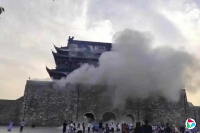 网传视频显示,鼓楼顶部最上一层边缘的瓦片缓慢掉落后,引发一整排瓦片瀑布式坍塌,扬起大量烟尘,整个过程持续了一至两分钟。