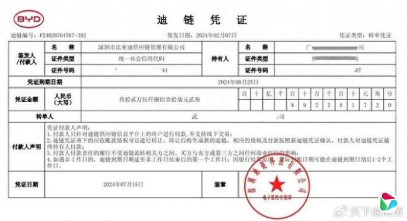 例如,比亚迪推出的商业承兑汇票系统“迪链”,就是通过电子债权凭证替代传统现金支付的典型案例。供应商交付货物后,不会立刻拿到现金,而是拿到一张电子欠条,在约定期限后才能收回款项。