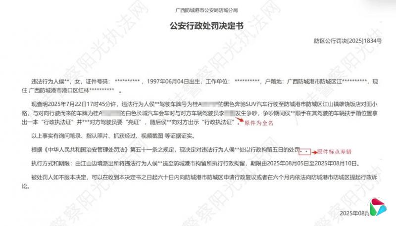 又过了两天,防城港市公安局防城分局8月5日发布行政处罚决定书,对侯女士处以行政拘留五日的处罚,理由是她涉嫌以虚假身份招摇撞骗。