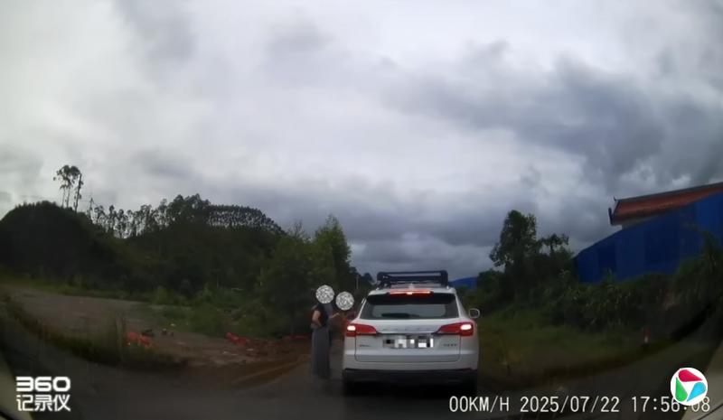 此时,跟在李先生后方车辆的记录仪也拍下了这一幕,显示女子右手拿着手机,左手握着某样物品,向前方展示了一下,并声称要报警。