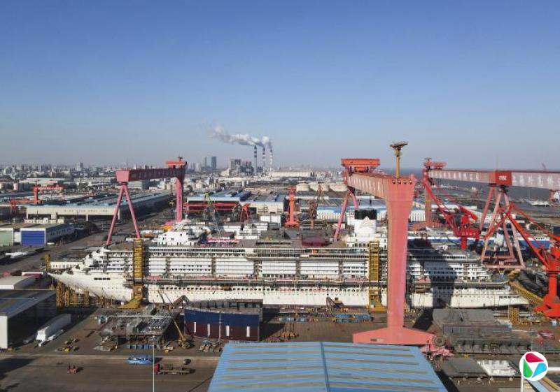 1月15日在上海外高桥造船有限公司2号船坞拍摄的国产大型邮轮“爱达·花城号”(新华社)
