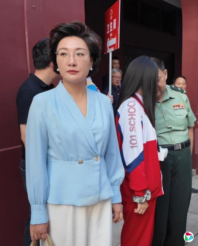 毛新宇夫人刘滨则身穿浅蓝色上衣,搭白色裤子。(视频截图)