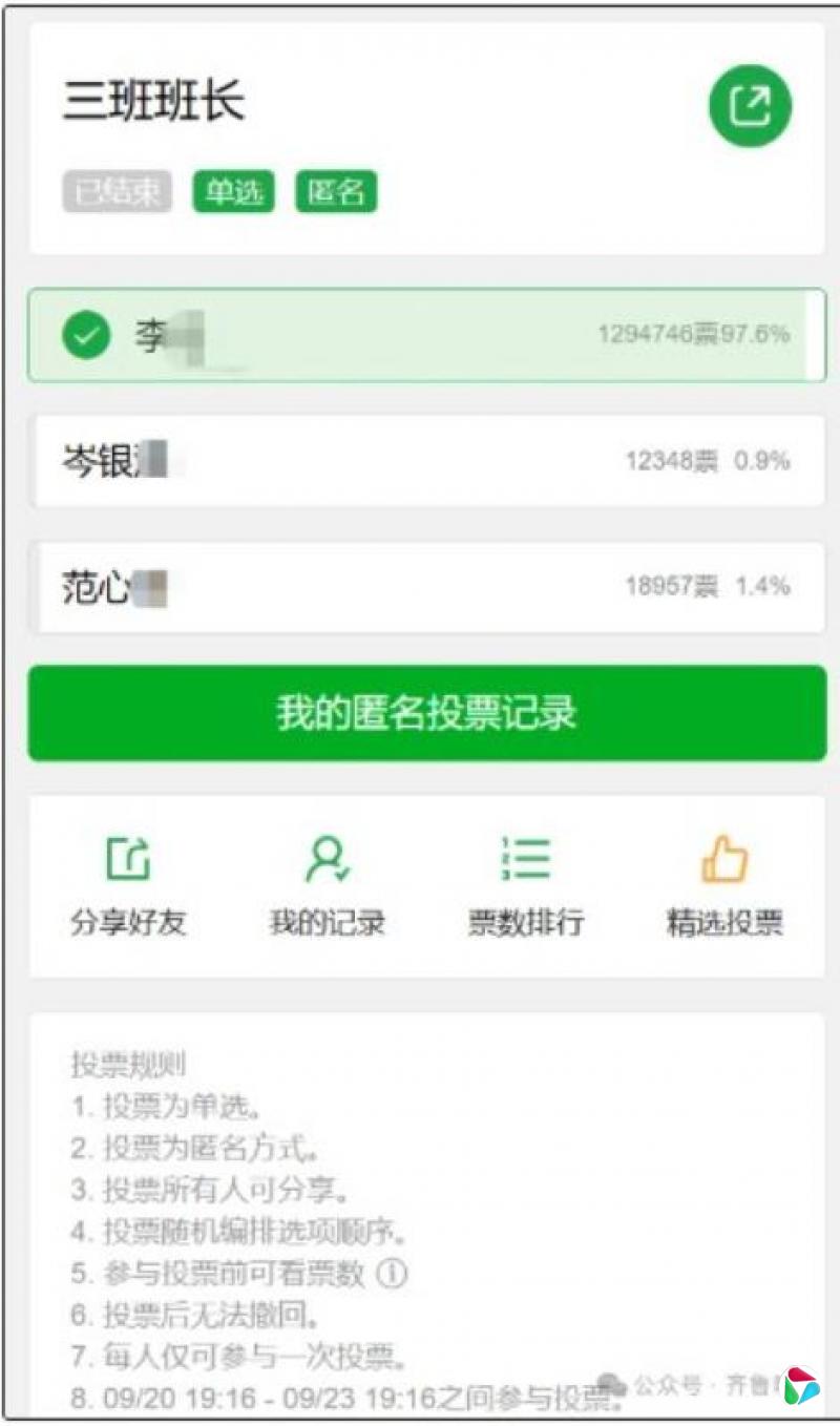 一个“三班班长”投选的小程序在微信上刷屏,吸引了超过百万网民投票。(齐鲁晚报微信号)