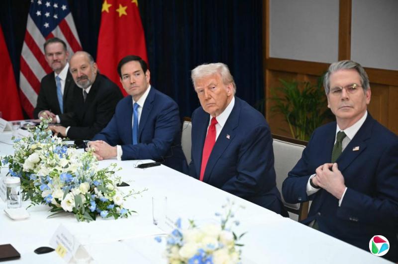 (左起)美国贸易代表格里尔、商务部长卢特尼克、国务卿鲁比奥、财政部长贝森特星期四(10月30日)陪同总统特朗普出席美中两国元首会晤。(法新社)