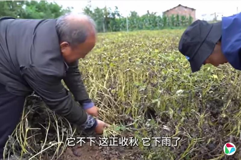 片中大片田地泥泞,不少耕田还有水洼。机械无法进入的情况下,一名农户只能弯着腰在地里徒手拔花生。他有些无奈地开玩笑:夏天各处跟老天爷申报下雨,一层层上报,到现在秋天了,审批下来了,正秋收,它下雨了。