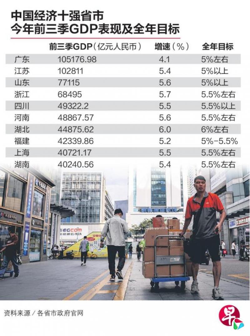 中国各省市近期陆续公布今年第三季地区生产总值(GDP)数据。经济十强省市之中,除了广东外,江苏、山东、浙江、四川、河南、湖北、福建、上海和湖南这九个省市的经济增速,均跑赢或持平5.2%的全国平均线。