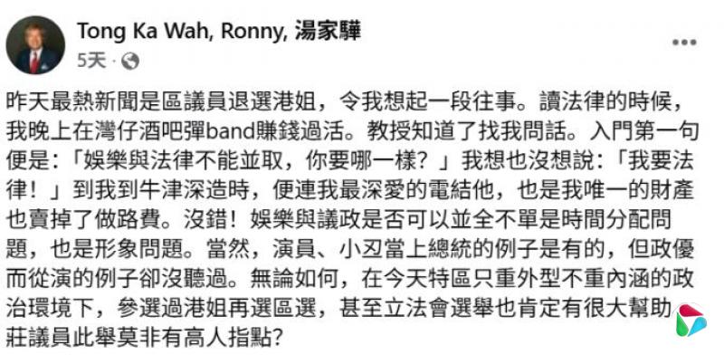对此,香港行政会议成员汤家骅在脸书发文点评,“娱乐与议政是否可以并全不单是时间分配问题,也是形象问题。当然,演员、小丑当上总统的例子是有的,但政优而从演的例子却没听过。”