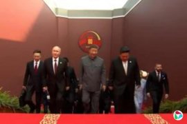 九三阅兵星期三上午9时开始,中国国家主席习近平与20多位国家元首和政府首脑一起登上北京天安门城楼,俄罗斯总统普京和朝鲜最高领导人金正恩分别站在习近平的右侧与左侧。