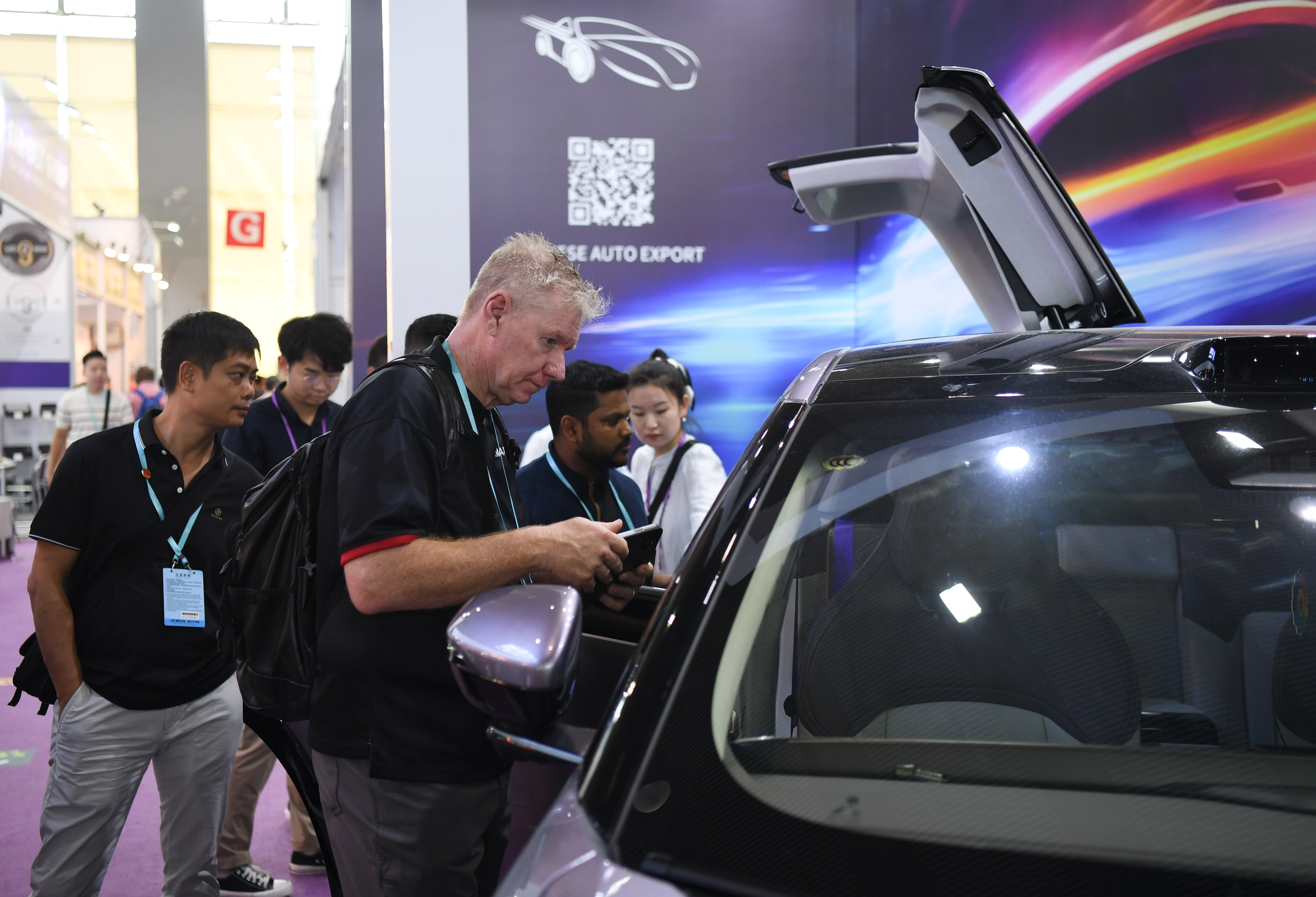 2023年10月16日,外国采购商观看广交会中国新能源汽车展台。(新华社)