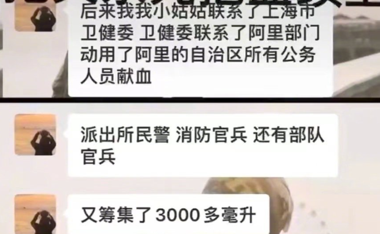 11月29日,网传一则聊天截屏显示,一名上海籍女子在西藏阿里地区因车祸重伤,女子家人自称为救她,通过小姑姑联系到上海市卫健委,并由上海市卫健委联系到阿里地区,动用阿里自治区所有公务员人员献血,其中包括派出所民警、消防员等,筹集血量达3000毫升以上。