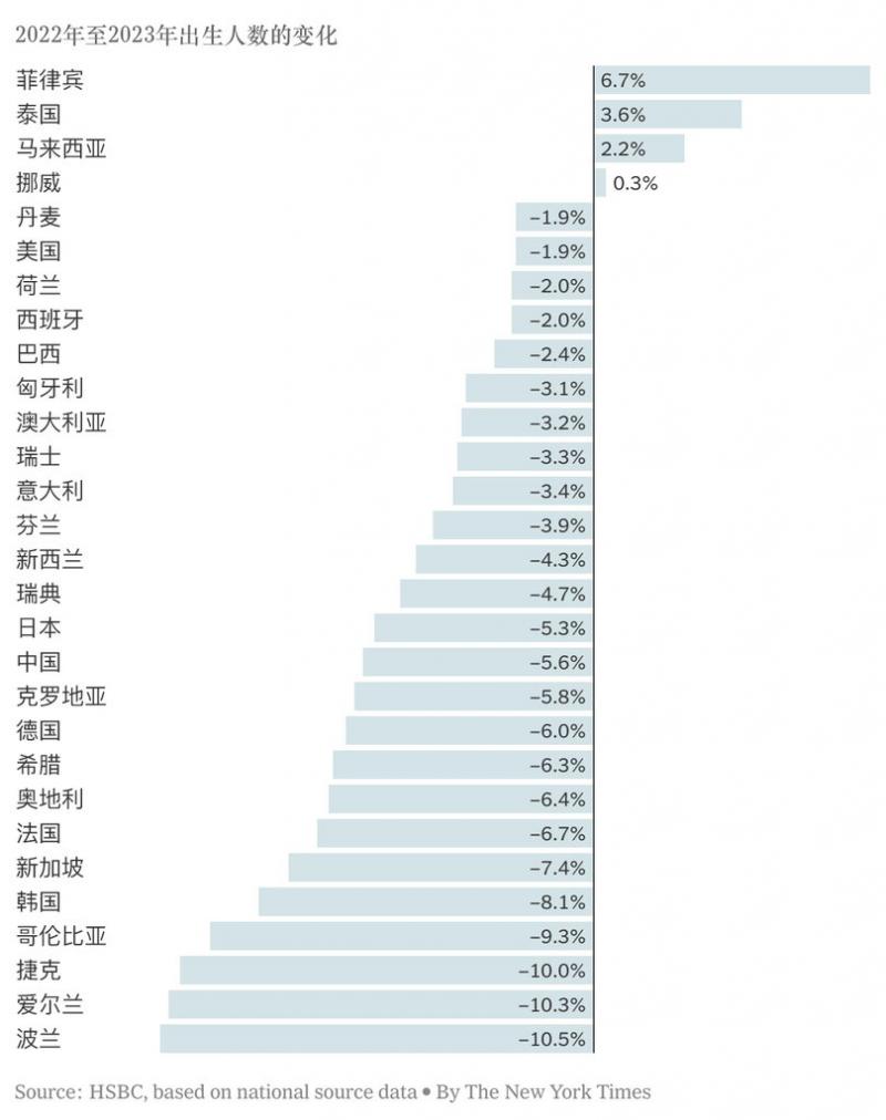 虽然最终数据可能略有不同,但它们不太可能改变下面这张图表所传达的信息,比起汇丰银行报告中的数据,该表略有更新。在波默罗伊设法获得数据的大多数国家,2023年的出生总数继续急剧下降。美国的表现好于大多数国家,下降了1.9%。捷克共和国、爱尔兰和波兰的降幅都在10%或以上。