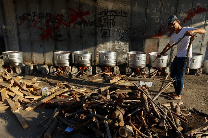 10月15日,加沙南部城市汗尤尼斯的居民烹煮食物,让大批躲到当地的难民填饱肚子。由于战时燃料短缺,他们只能烧柴火煮食。(路透社)