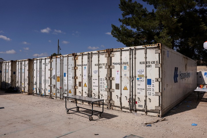 哈马斯枪手渗透到以色列多地杀人和绑架,以色列有1400多人死亡,包括279名军人。10月13日,大批遗体被暂时存放在集装箱里,等待亲人认领安葬。(路透社)