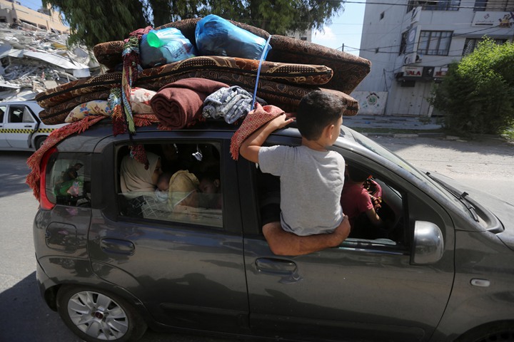 10月12日深夜,以色列通知联合国,要加沙北部的110万平民24小时内迁移到南部,许多巴勒斯坦人匆忙收拾细软,带着家人逃离家园。(路透社)