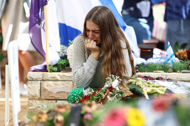 10月15日,耶路撒冷赫茨尔山的国家军人墓园举行葬礼,一名女子为死于哈马斯枪下的21岁下士德维尔·利沙哭倒在地。(路透社)