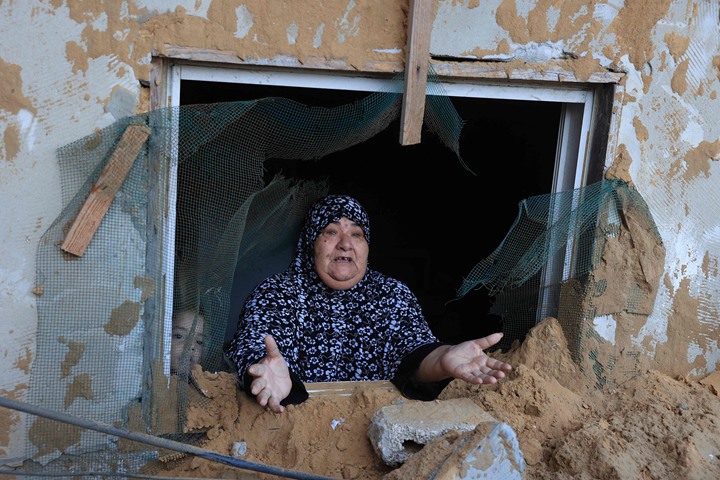 10月15日,以色列的导弹击中加沙南部拉法市(Rafah)一个难民营,侥幸逃过一劫的巴勒斯坦妇女一脸无奈。尽管巴勒斯坦人从加沙北部逃到南部,但南部地区也未必安全。(法新社)