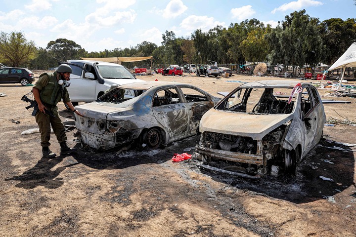 哈马斯枪手10月7日清晨进入以色列境内后,到距离边界不到五公里的以南内盖夫沙漠(Negev desert)超新星音乐节屠杀与会者,包括以色列人和许多外国人。以色列官方称,音乐节现场有约270人死亡,大多数是年轻人。以色列军人事后在现场搜证。(法新社)