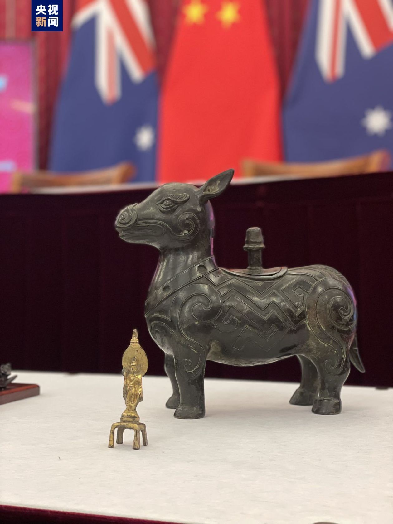 澳大利亚国家美术馆向中国政府捐赠了一件牛形的盛酒礼器“牺尊”,是明清或近代的仿古文物艺术品。(央视新闻)
