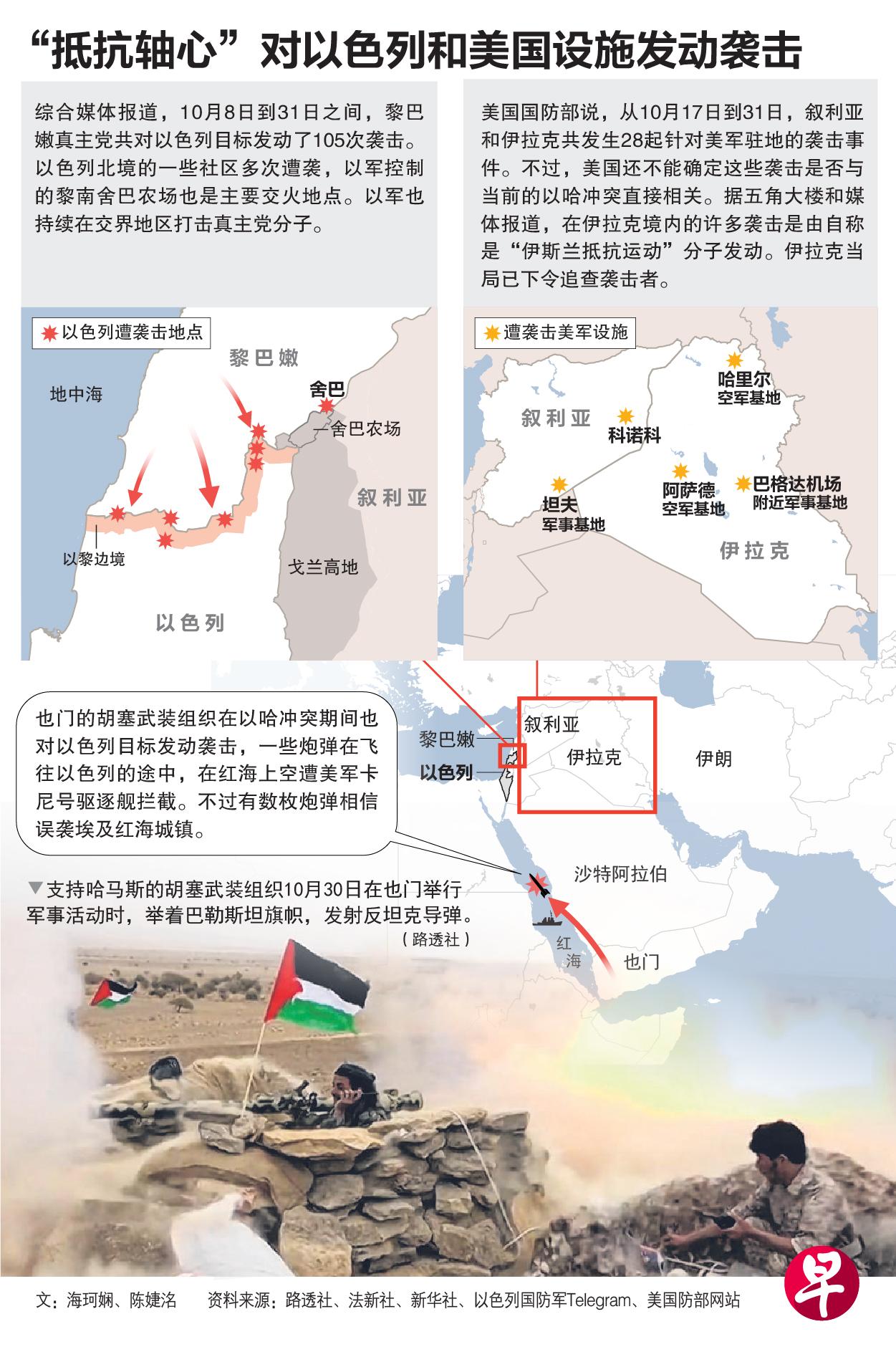 10月7日,“抵抗轴心”的哈马斯连同巴勒斯坦回教圣战组织突袭以色列南部和中部地区,造成约1400人死亡,240人被掳走为人质。以色列随即展开报复,猛烈炮轰加沙的疑似哈马斯据点,据加沙卫生部,以军轰炸至今已夺走了9000多条人命。