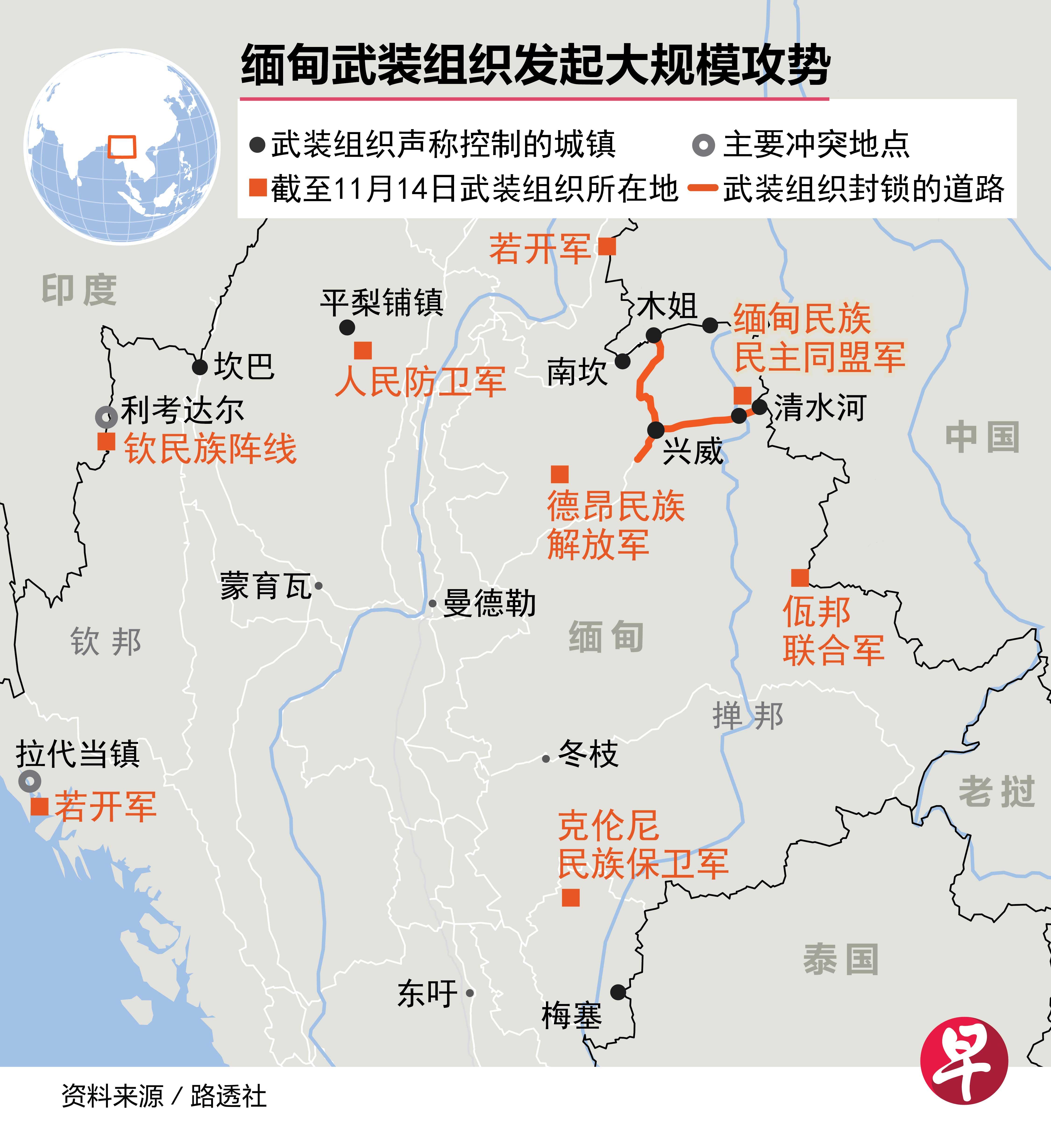 在缅甸东北部的掸邦,缅甸民族民主同盟军和德昂民族解放军继续攻击当地的缅军据点。