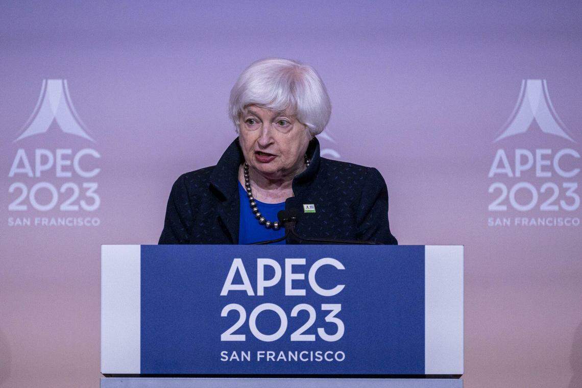 美国财长耶伦说,中国大陆希望通过和平方式实现与台湾统一的目标。照片为耶伦于11月13日在旧金山出席亚太经济合作组织财长会议后在新闻发布会上讲话。(彭博社)