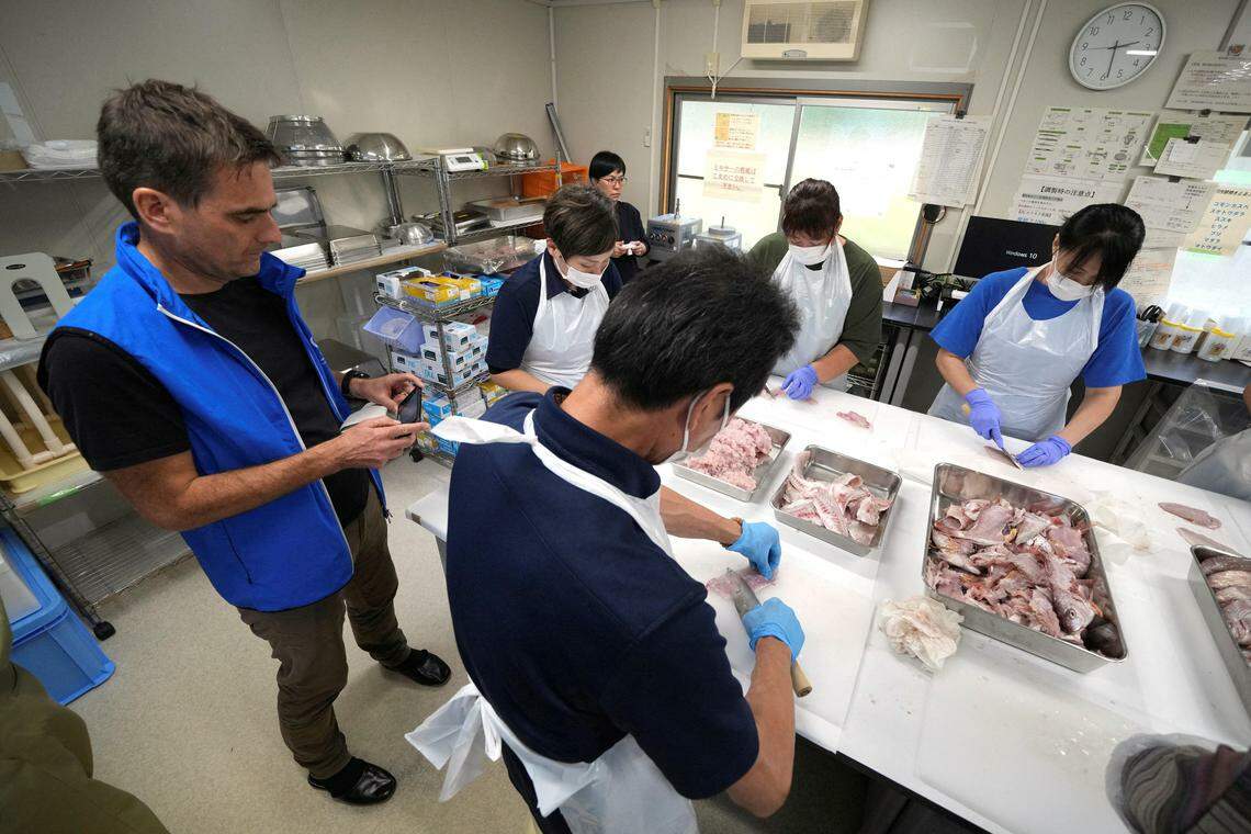 日媒称,日中极有可能建立一个框架协商福岛核处理水排放问题,为解除日本海鲜进口禁令铺路。图为国际原子能机构专家小组10月20日在福岛海洋生态研究所视察鱼类样本放射性检测分析。(路透社)