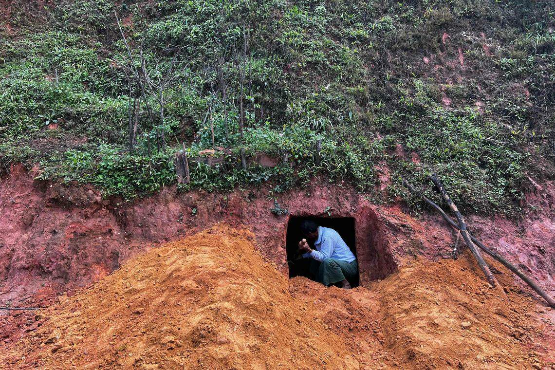 12月14日,南散镇一个居民在住家附近的山坡挖掘防空洞。德昂军16日称拿下南散控制权,缅军则指战事还在继续。(法新社)