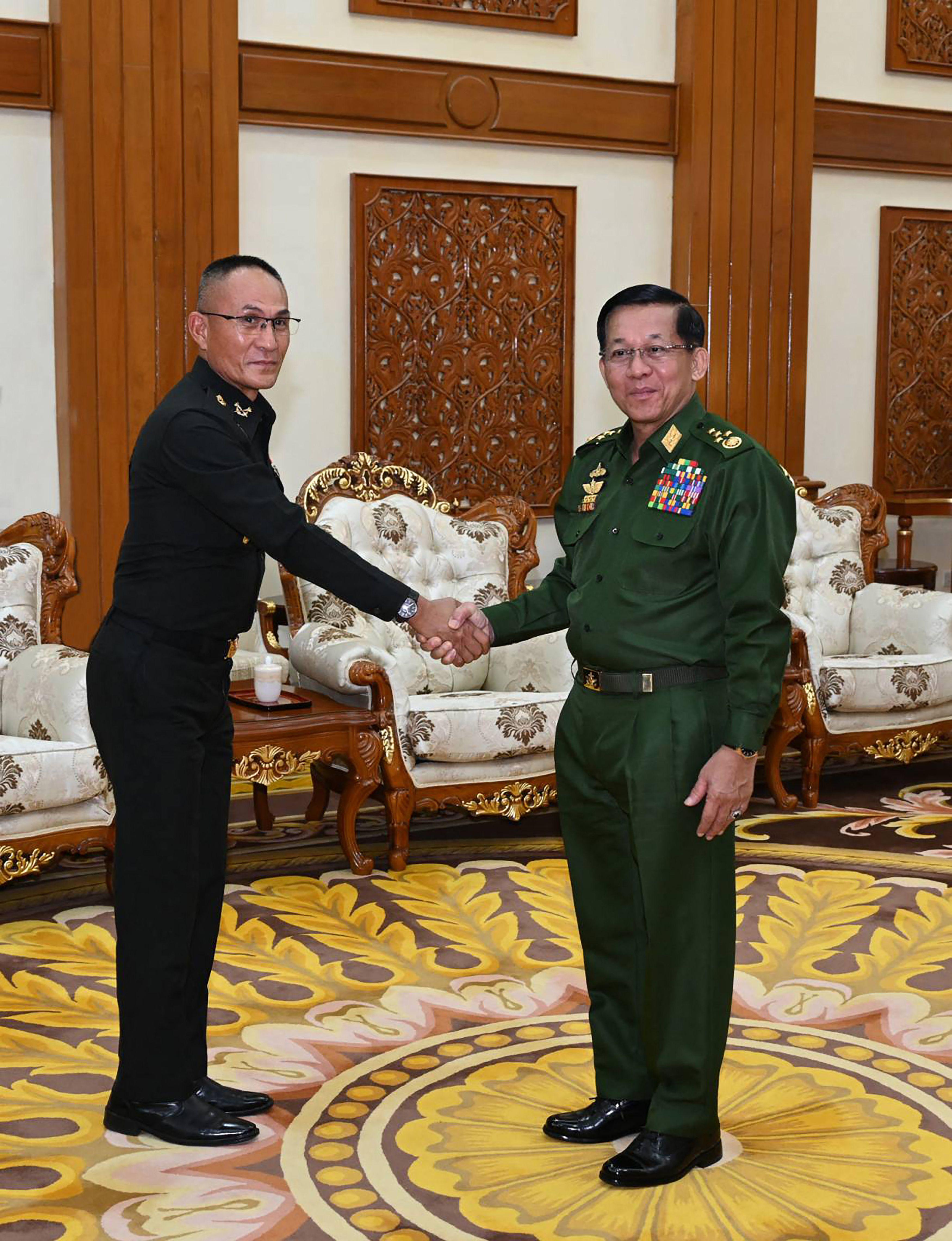 缅甸军政府领袖敏昂莱(右)和泰国皇家武装部队联合作战局局长乍甲邦在内比都会晤,商讨合作打击缅泰边界的非法活动。(法新社)