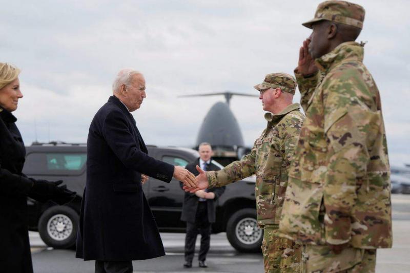 拜登(左前)与夫人吉尔在多佛空军基地迎接从约旦运返回国的三名殉职士兵的灵柩,并与一同出席仪式的美军将领握手。(路透社)