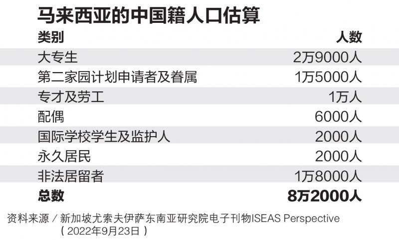 饶兆斌2022年9月在新加坡尤索夫伊萨东南亚研究院电子刊物ISEAS Perspective发表的报告估算,马国的中国籍人口至少有8万2000人,其中约35%是留学生,其次是第二家园签证持有者及眷属(18%),排第三的是专才及劳工(12%)。