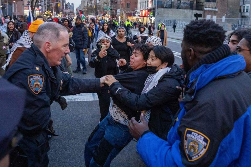 在美国纽约,有同情巴勒斯坦的示威者在国际妇女节(3月8日)举行抗议活动,堵住道路造成交通阻塞,被警方逮捕。(法新社)