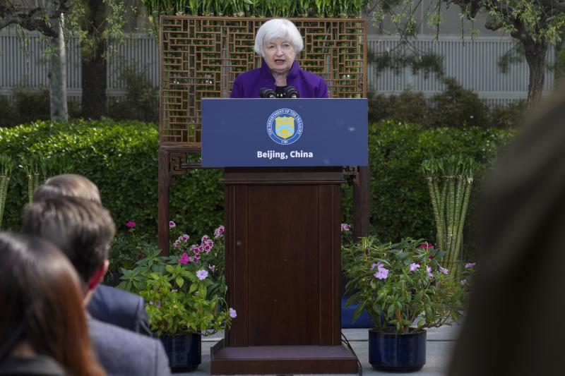 美国财长耶伦8日在北京的发布会上发言。(美联社)