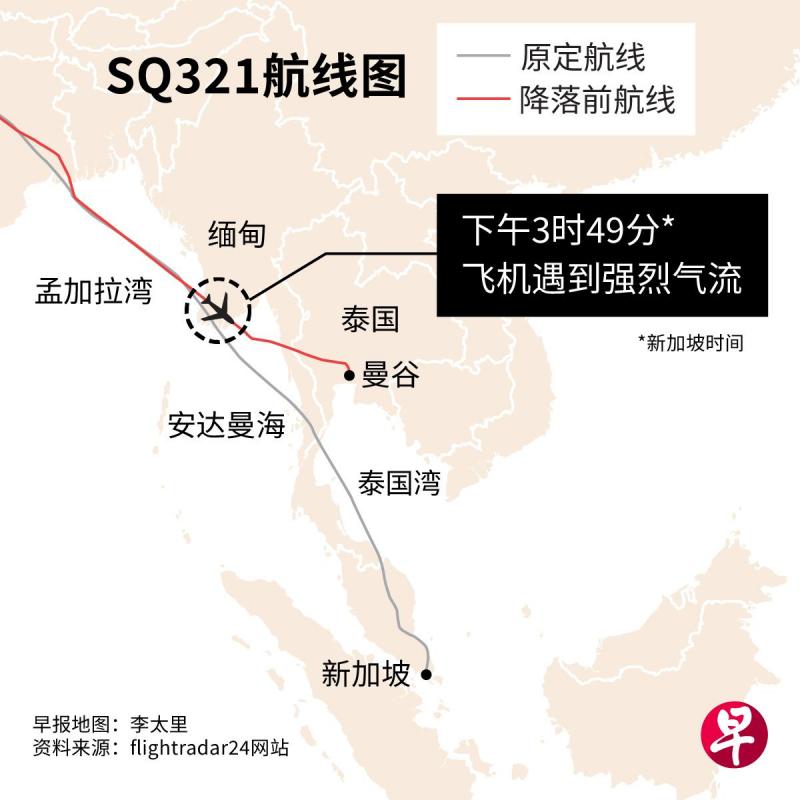 事发在新加坡时间星期二(5月21日)下午约4时。客机在缅甸上空突然遇到强烈气流,机长过后宣布机上有医疗紧急状态,要求在泰国曼谷降落。有30人被送进当地医院接受治疗。