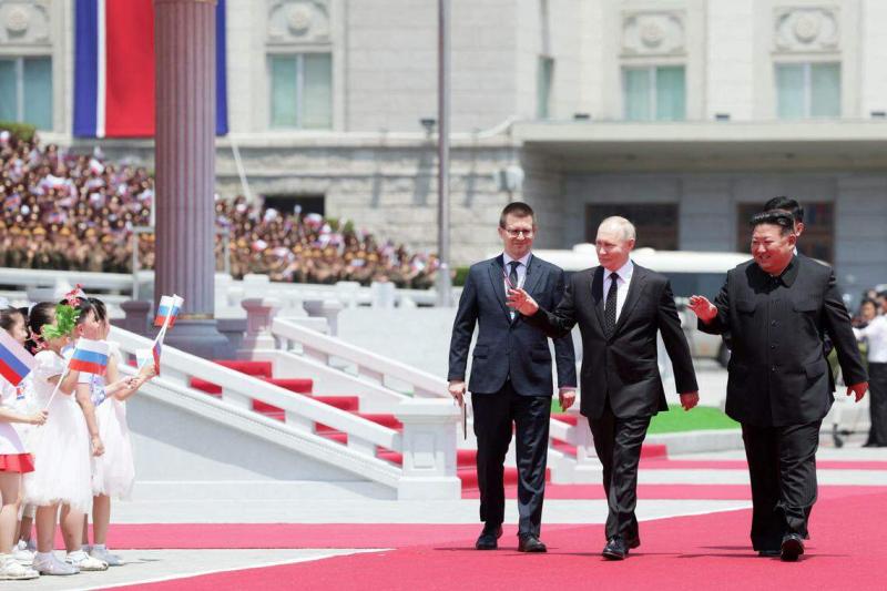 普京星期三凌晨2时许飞抵平壤,这是普京时隔24年第二次访问朝鲜。在会谈前,金正恩和普京共同出席了在金日成广场举行的欢迎仪式。