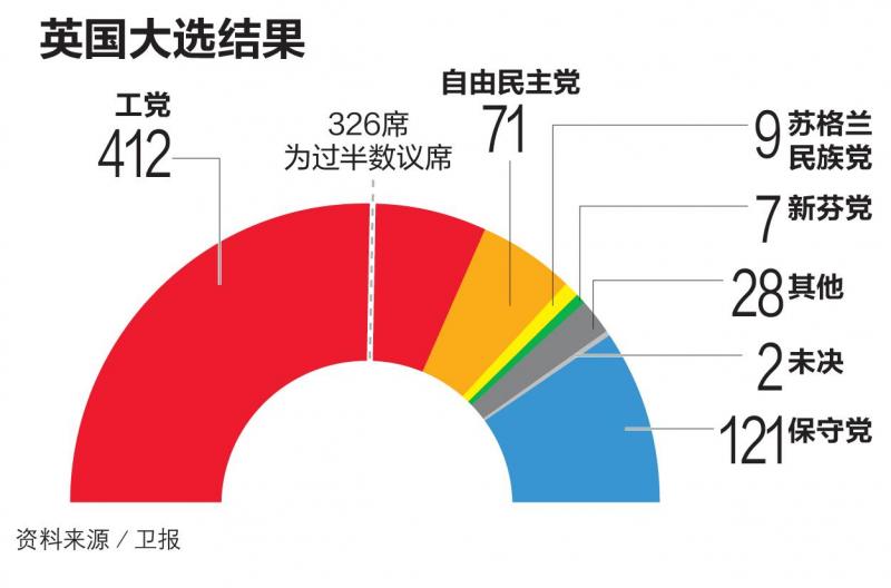 英国大选计票结果显示,在议会下院650议席中,工党赢得至少412席,远超326席的过半门槛;保守党所获议席骤降至121席,剩余席位由其他党派及独立候选人获得。