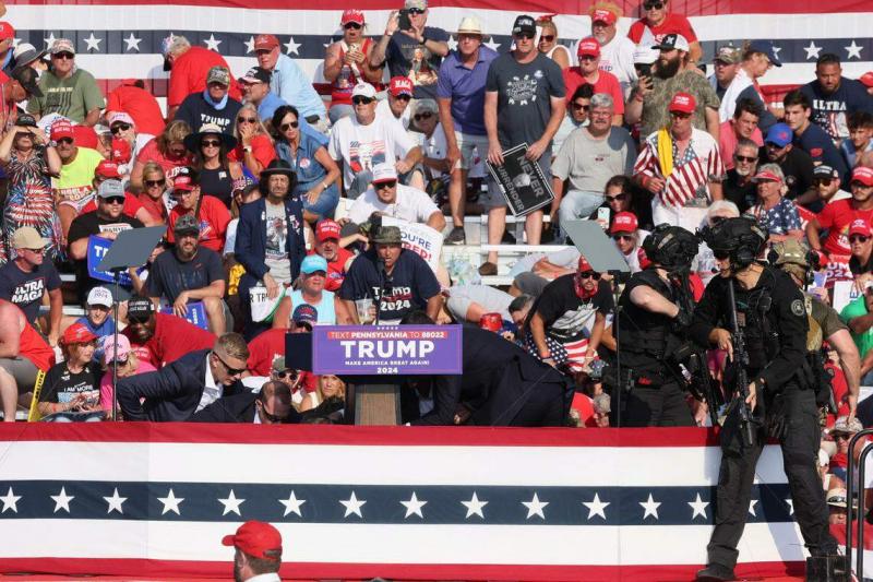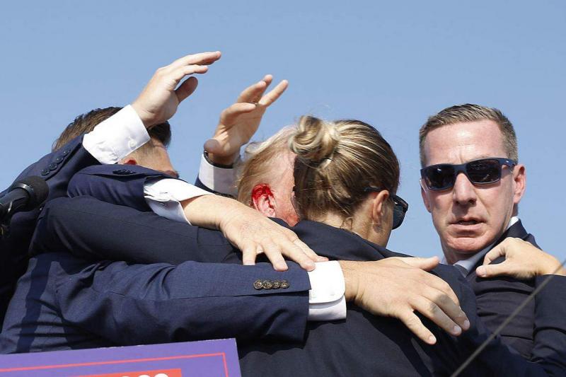 星期六(7月13日)傍晚,特朗普在宾州巴特勒市的集会上发表演讲时,现场突然传出多声枪响,特朗普捂了一下右耳后躲到演讲台后方,特勤局人员随即冲上台将他围住保护,随后送他离开现场。
