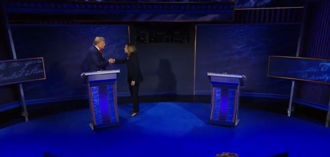 社媒用户据报在辩论一开始就上载哈里斯走向特朗普,与他握手并自我介绍的那一刻的短片。(视频截图)