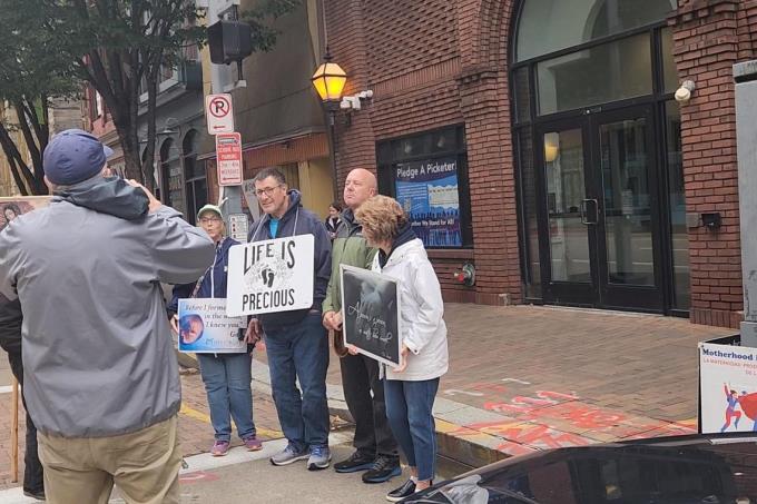 宾夕法尼亚州匹兹堡市一家堕胎诊所外站着六个人,手里举着“生命宝贵”等标语和人类胚胎图案,并不停祷告。每当有人走进诊所,他们便朝诊所举起标语,希望能让准备打掉腹中胎儿的孕妇回心转意。