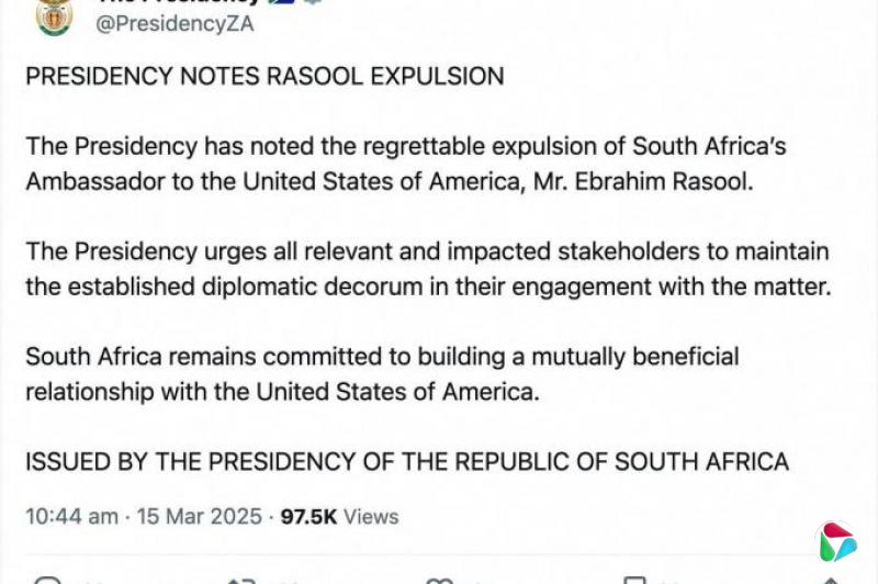 南非总统办公室周六(15日)对美国驱逐南非大使表示遗憾,呼吁两国维持外交礼仪,并称“南非依然致力于与美国建立互惠互利的关系”。南非国际关系与合作部则表明,南非政府将通过外交渠道与美方接触。