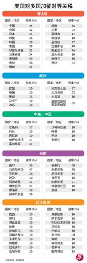 特朗普宣布对最重要的盟友欧盟征收20%对等关税,对一些亚太经济体征收的关税更高,对中国的新税率高达34%,越南46%,泰国36%,台湾32%,韩国25%,日本24%,马来西亚24%。对美国商品不征收关税的新加坡也面对10%的关税率。
