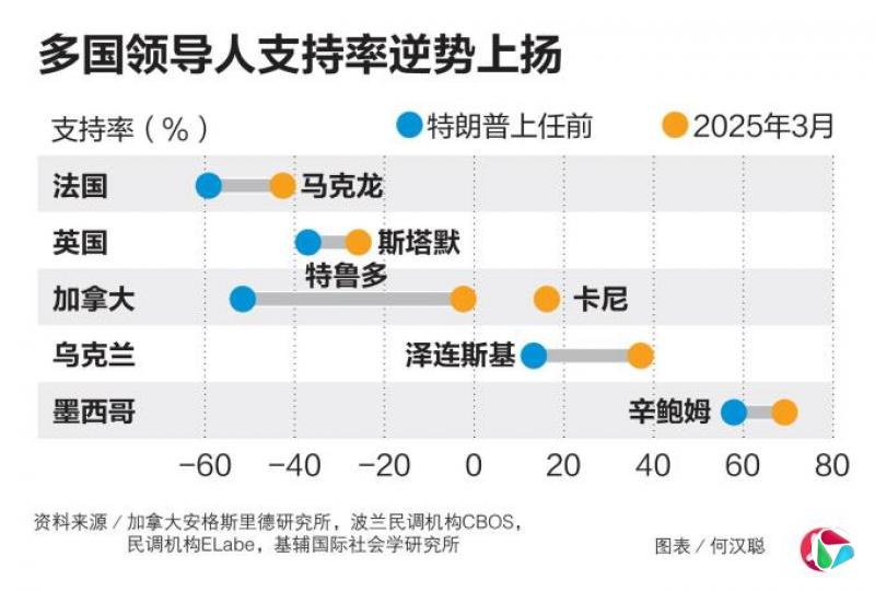 特朗普政府还向全世界发起贸易战,对多国征收高额关税。这些行径迅速引起激烈反弹,“特朗普效应”也催生一股反美浪潮,这在那些与特朗普掀舌战的国家尤其明显。敢于与特朗普正面对抗的国家领导人,民调支持率纷纷逆势上扬,泽连斯基便是一个例子。