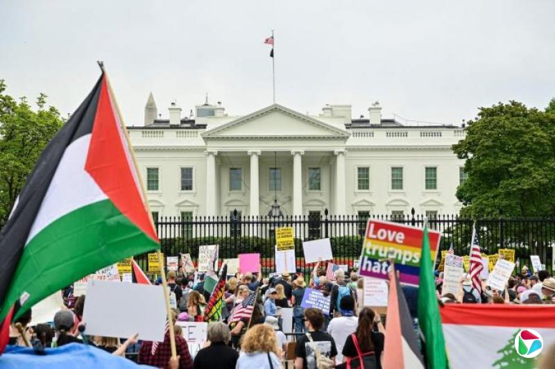 路透社报道,媒体镜头显示,在白宫外,抗议者举着写有“工人应该拥有权力”、“不要王权”、“停止武装以色列”和“正当程序”的横幅。