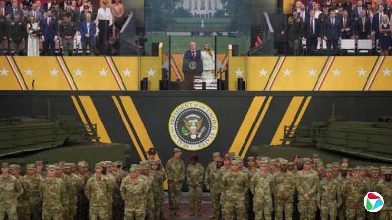 阅兵当天,特朗普站立敬礼,观赏数千名身穿制服的士兵、数十辆坦克与军用车辆通过。现场还有军乐队表演。