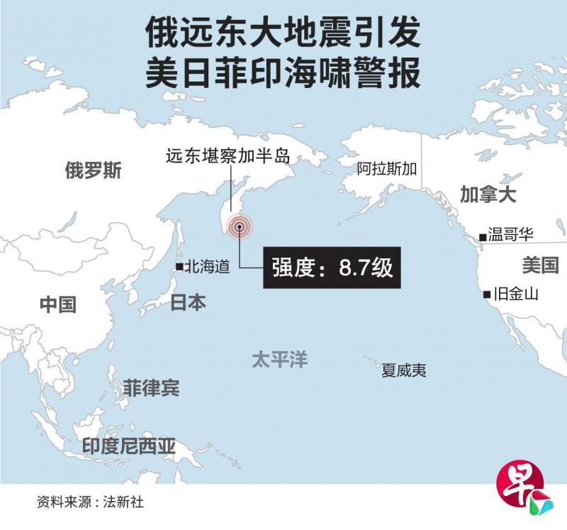 俄罗斯堪察加半岛东部海域发生强烈地震后,美国夏威夷、阿拉斯加、西海岸地区和关岛等地星期三(7月30日)启动不同等级海啸预警机制。