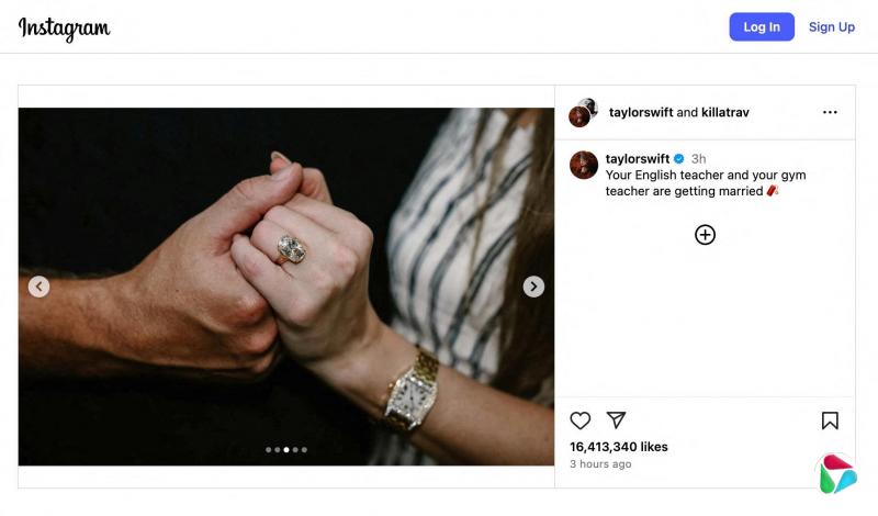 泰勒丝在贴文中附上堪萨斯城酋长队(Kansas City Chiefs)球员凯尔西在花园中向她下跪求婚等多张美照。照片中显示两人拥抱、牵手的场景,其中一张可以看到她的订婚钻戒。