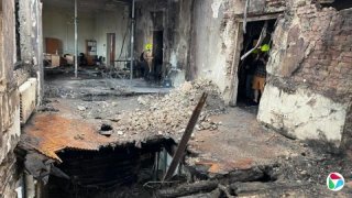 受损区域的屋顶和部分墙壁已被炸开,地板上有一个大洞。