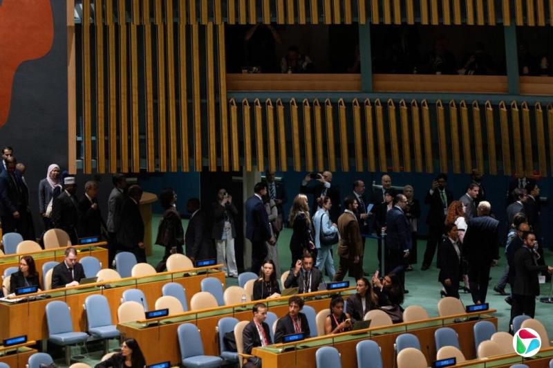新华社报道,内坦亚胡在星期五(9月26日)的联合国大会一般性辩论第一个走上发言台,众多落座不久的联合国会员国代表立马起身离席,从不同方向退场抗议,数人径直从内坦亚胡面前走开。代表席顿时空空荡荡。据《以色列时报》报道,退场代表来自阿拉伯国家、伊斯兰国家、非洲国家以及一些欧洲国家。以色列代表团以及内坦亚胡请来的亲友团则全体起立,大声鼓掌,试图转移视线。